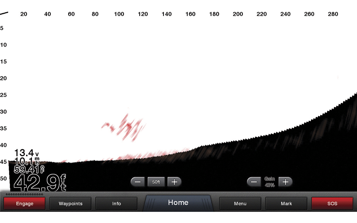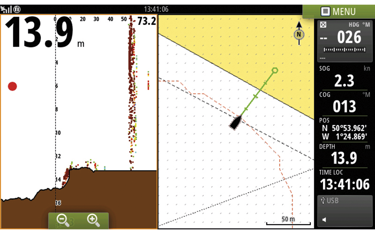 This should give you a few boat-lengths warning of a grounding in shallow water – and up to 100m view ahead when it’s deeper.