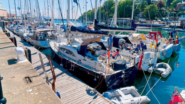It takes some adjusting but it’s usually possible to create a clear lead for both bow and stern lines from the pontoon cleats to the outside yacht without causing any chafe or damage on the other yachts. The shore lines should take the weight of the yacht during the gale but not be overtightened or the outside yacht will be taking the weight of the inside ones.