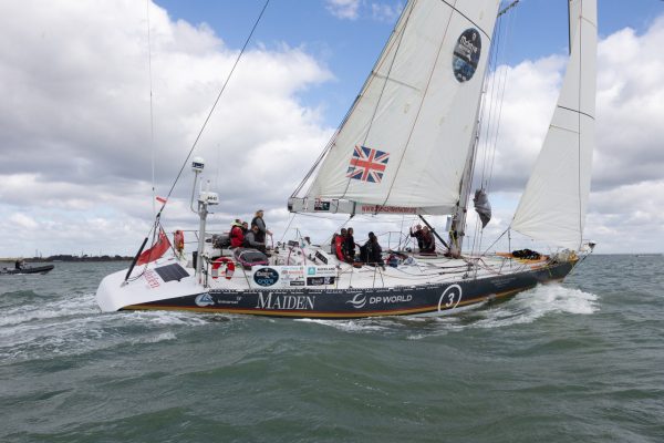 Maiden swept up the Solent before a Force 5-6 gale on Tuesday morning to take provisional overall honours in the 27,000 mile Ocean Globe Race.