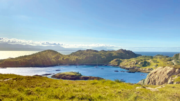 At the island of Gigha, we picked up a visitor’s buoy in Ardminish Bay. This is a beautiful, community-owned island edged with white sandy beaches. We met up with friends here on yacht A Capella of Belfast with whom we would be cruising in company. We got supper from The Nook seafood takeaway with a locally sourced menu offering tempura squid, halibut panko bites, lobster, and pickled samphire. I always like to buy the island’s glass-bottled, traditionally made milk produced by the Wee Isle Dairy.