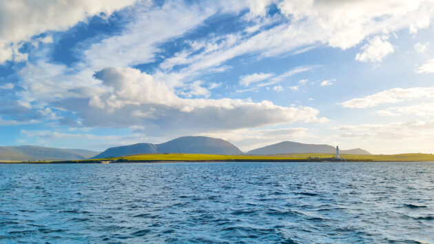 To the west, the towering peaks of Hoy are very prominent, rising far higher than the rest of the landscape. As we motored across towards Stromness, the water was silky smooth, with barely a breath of wind to disturb it.