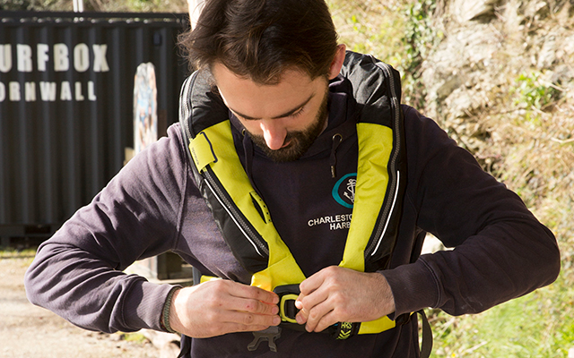 Shoreside the lifejacket when packed has quite a rigid feel and is notably substantial in the hand. (1.3kg) The sculpted shape of it makes it a bit of a space hog in a kit bag. It comes with it’s own mesh bag for cupboard hanging and stowage.