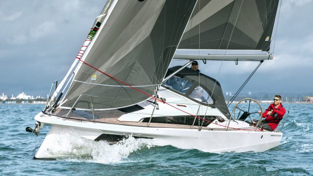 The mainsheet is anchored to a fixed padeye between the wheels – there’s no option for a traveller – so sail shape is handled by the kicker and while that probably cost us a few degrees of pointing, who’s going to argue when your boat looks this mean?